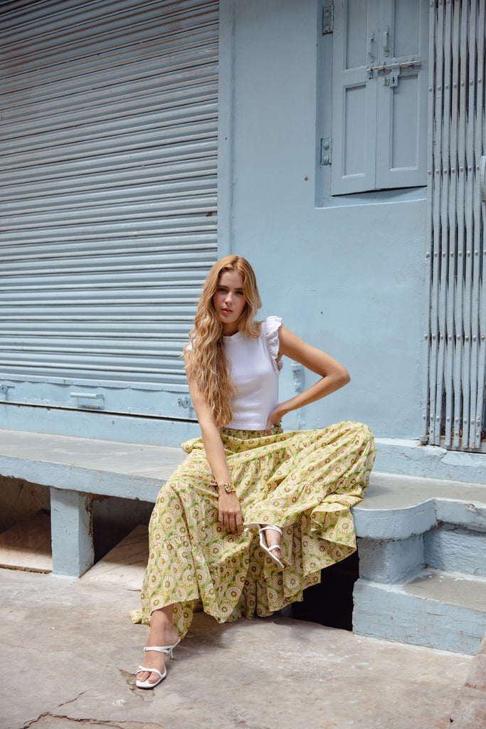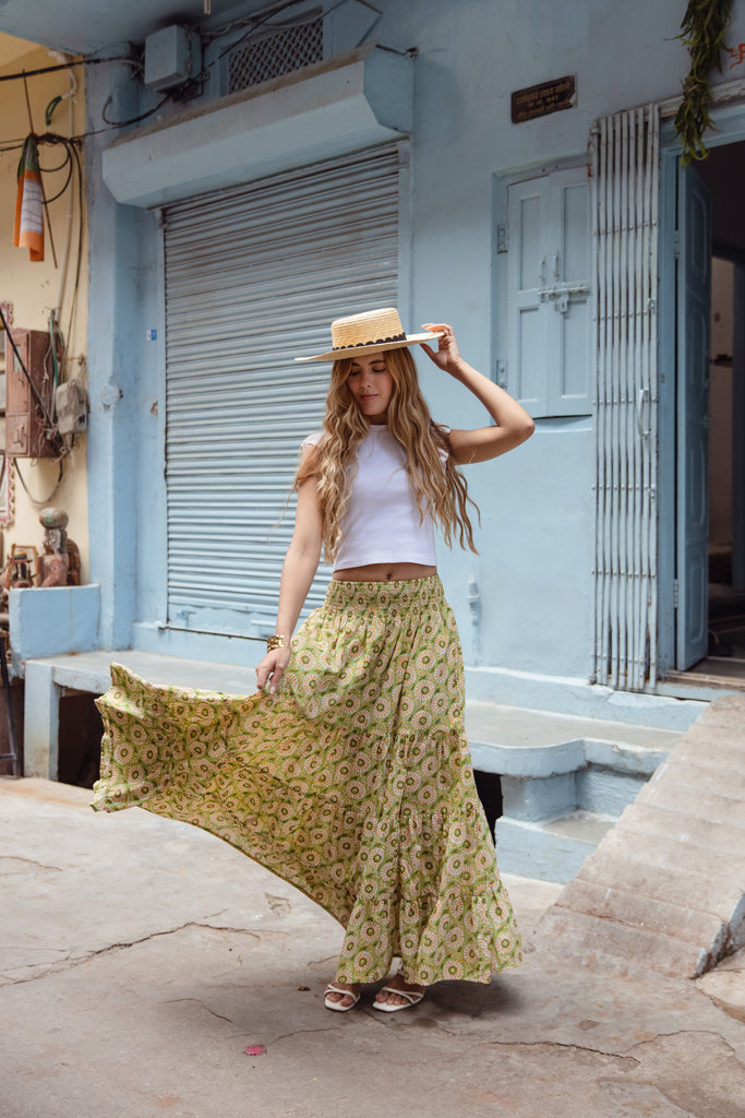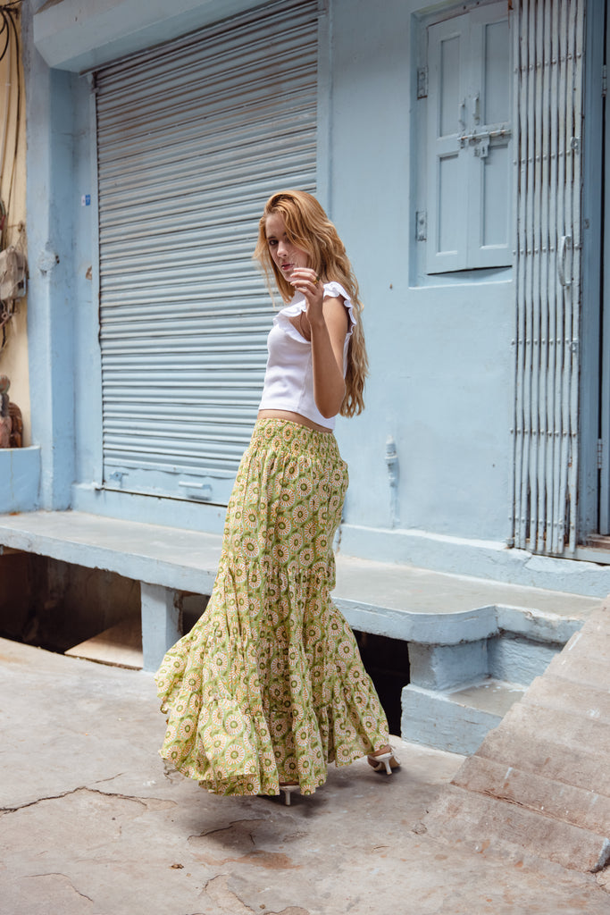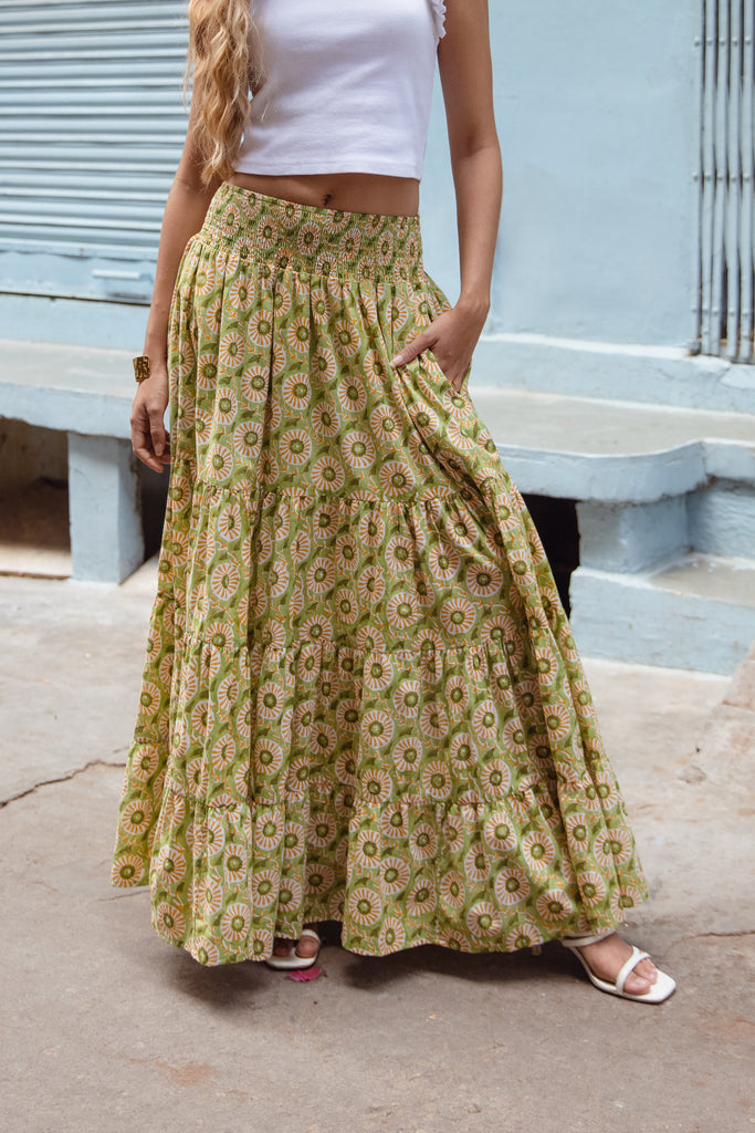 • Embrace effortless style with our cotton maxi skirt, designed for comfort and versatility. This skirt features a beautiful block print pattern that adds a touch of artisanal charm.