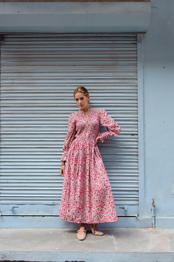 The Veda - Midi Cotton Block Print Dress - Pink Floral Print