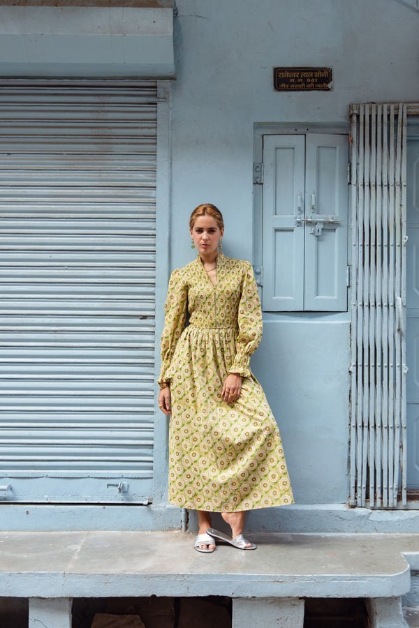 SALE The Leela - Midi Cotton Block Print Dress - Powder Blue
