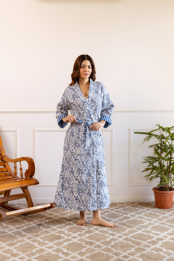 Luxury Quilted Hand Block Print Robe - Azure Bloom