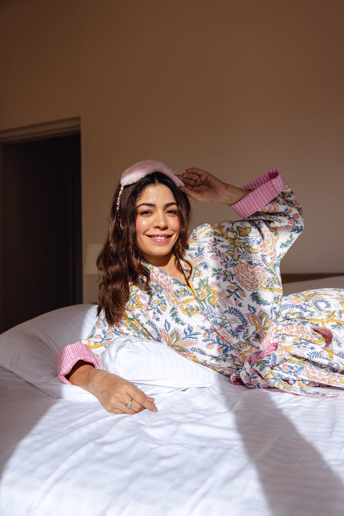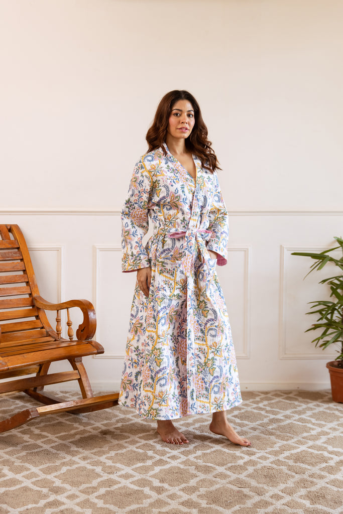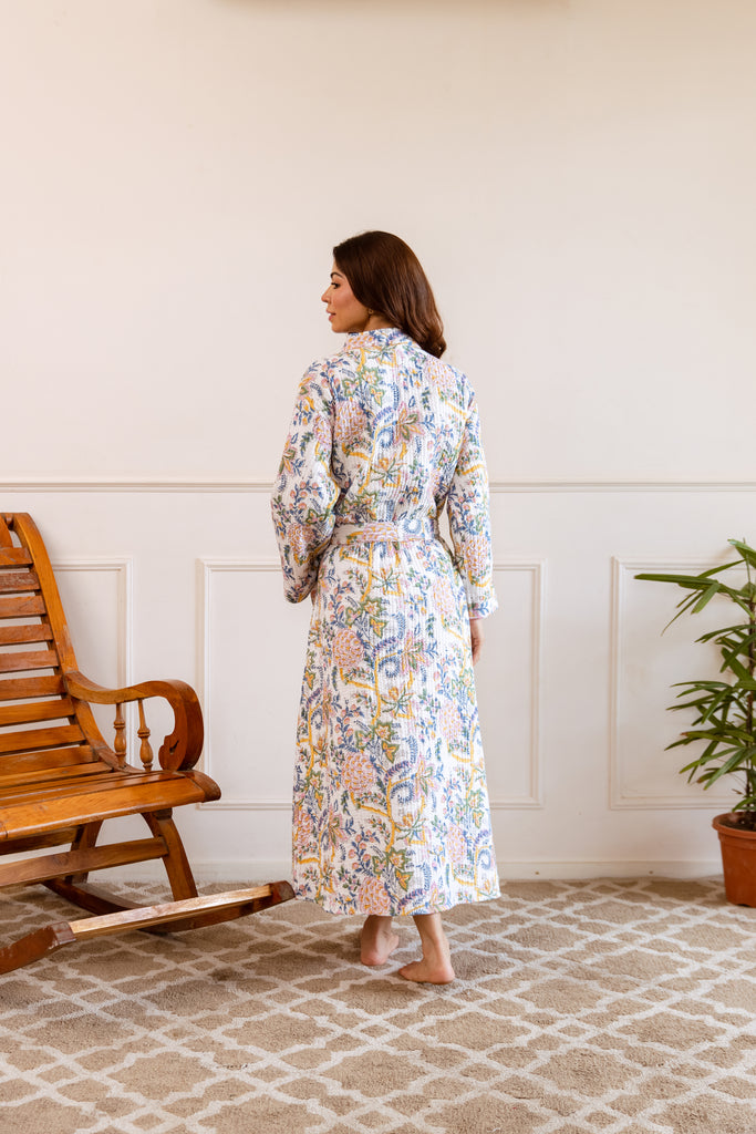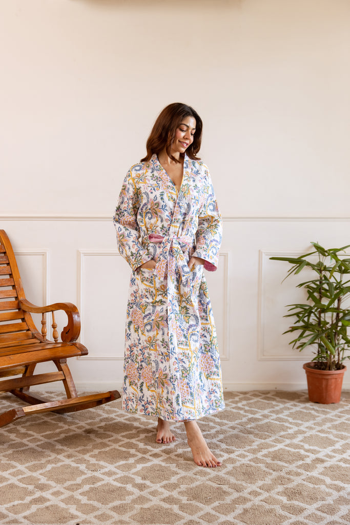 The cosiest of elegant robes in 100% cotton hand block print.