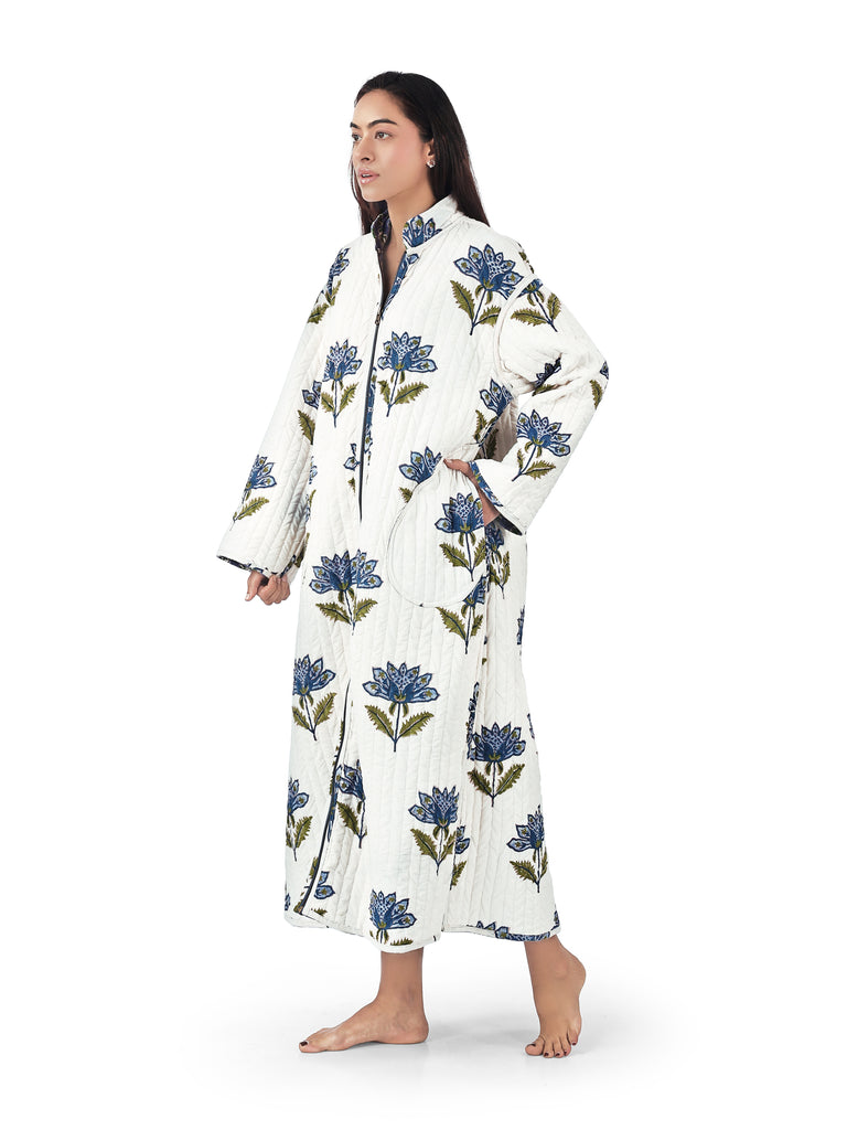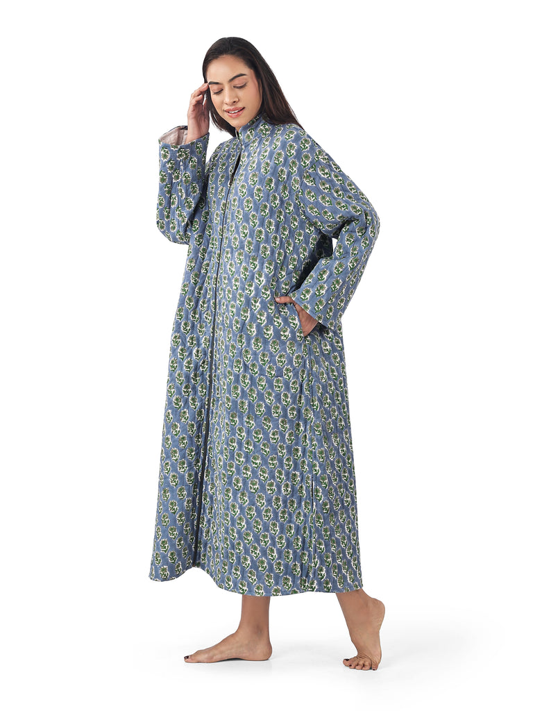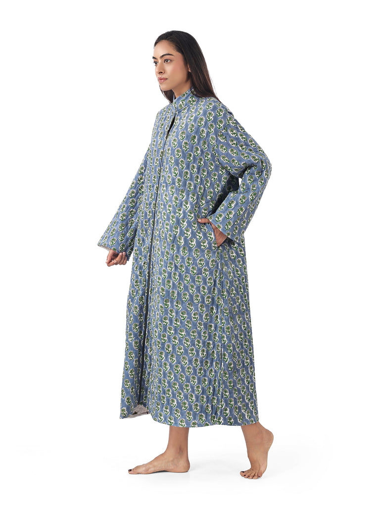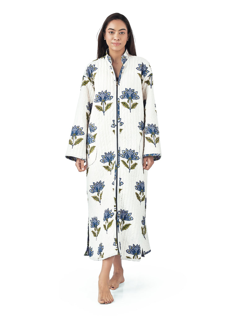 Reversible Zip Front, Luxury Quilted Hand Block Print Robe - Blue