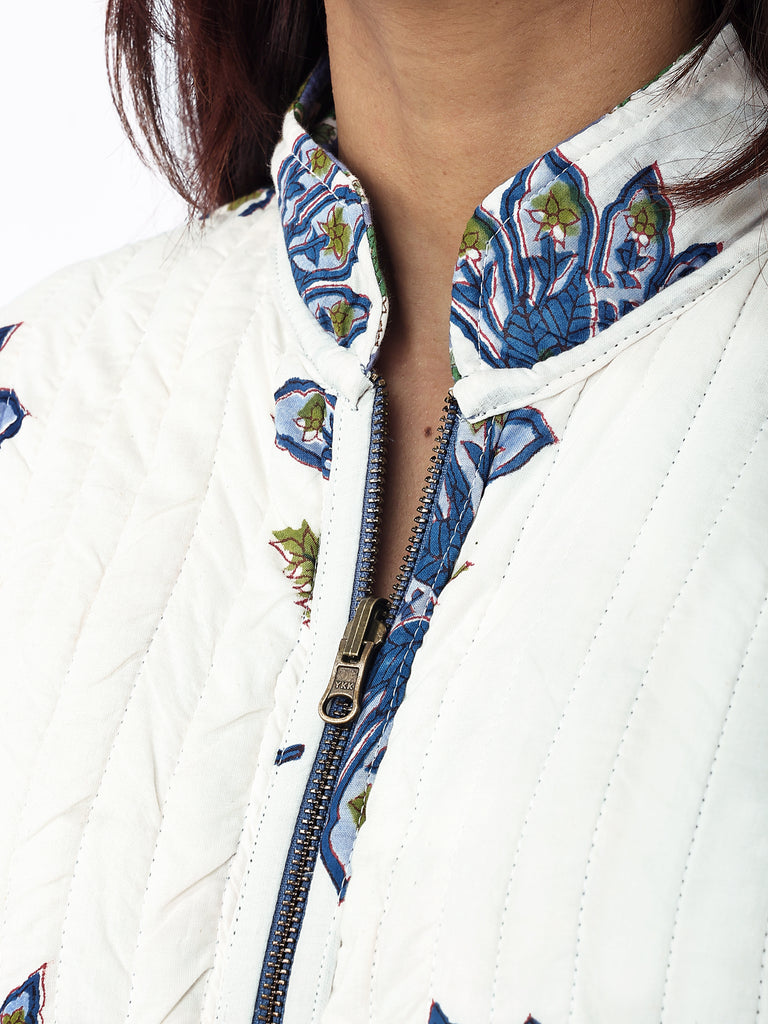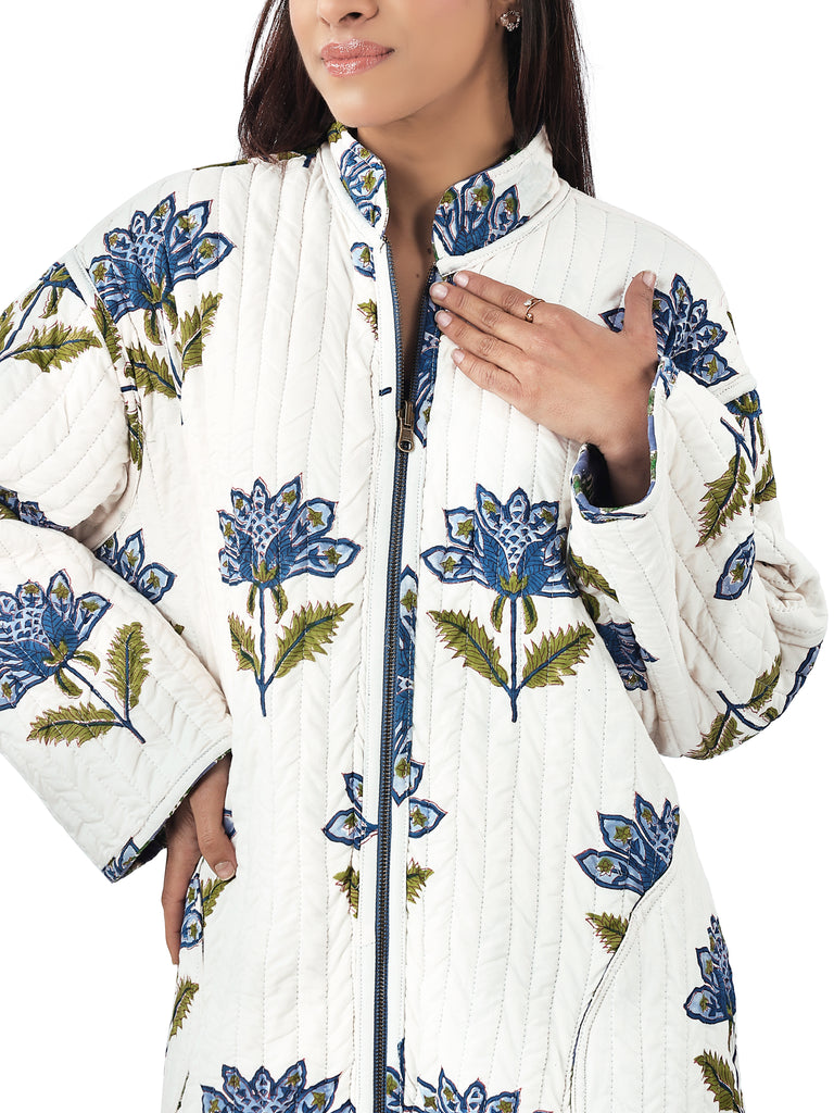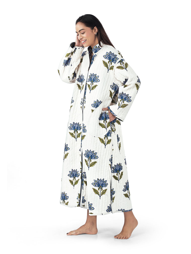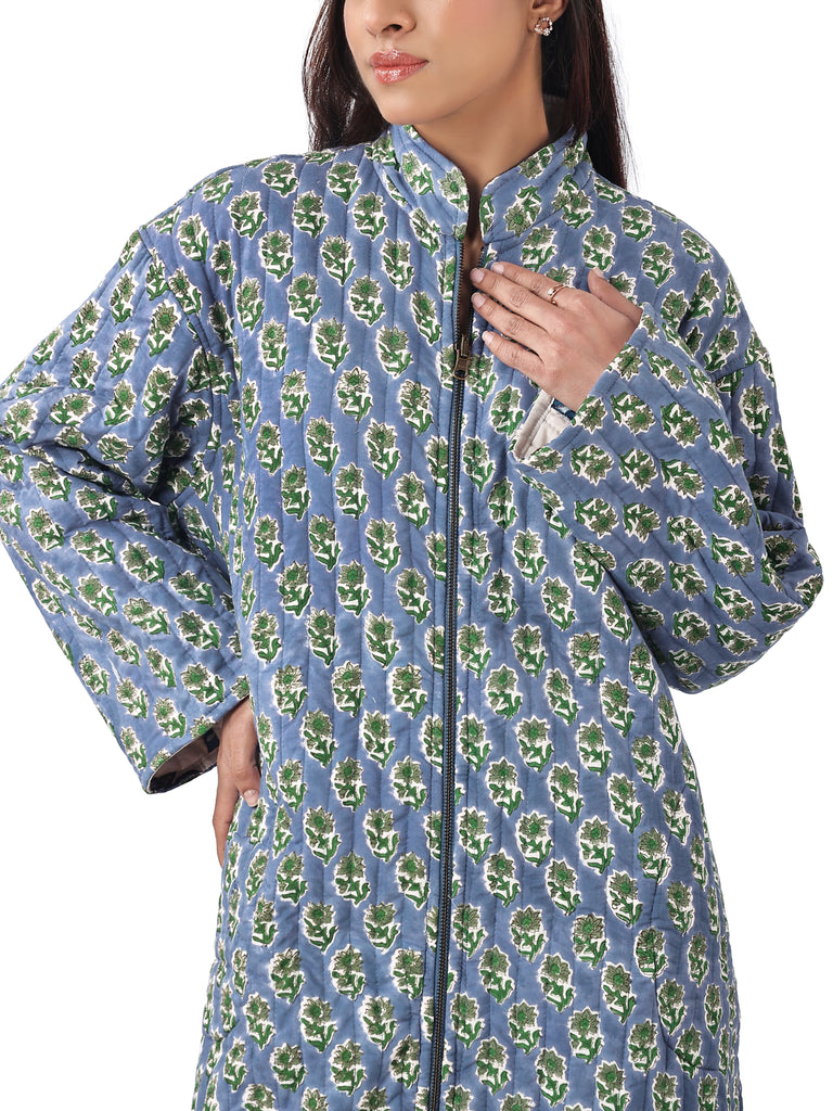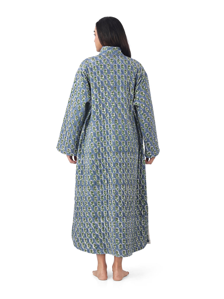 Reversible Zip Front, Luxury Quilted Hand Block Print Robe - Blue