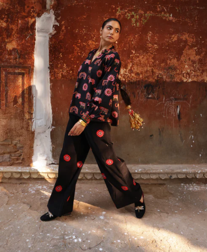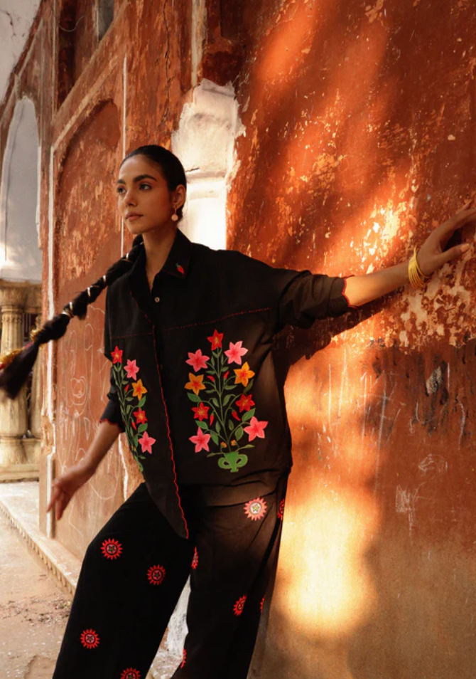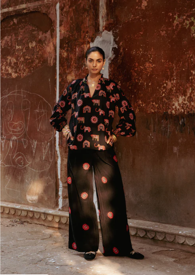 The Blossom Sun Embroidery Trousers celebrate the artistry of Jaipur's master embroiderers, worked by hand onto luxurious cord in a radiant sun motif.