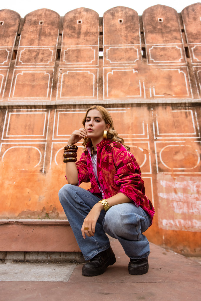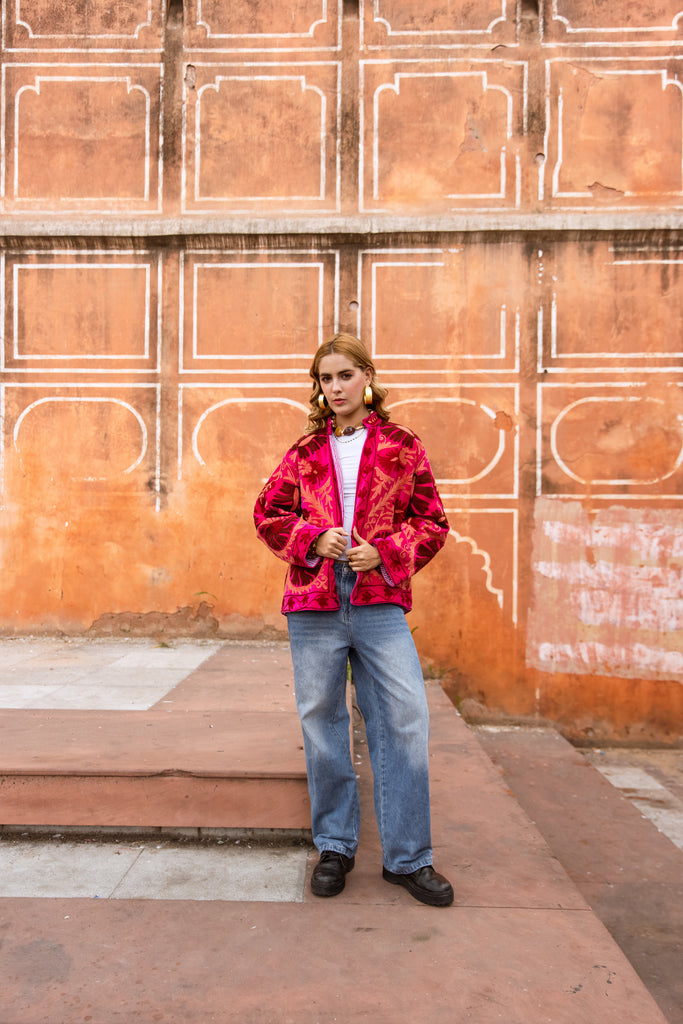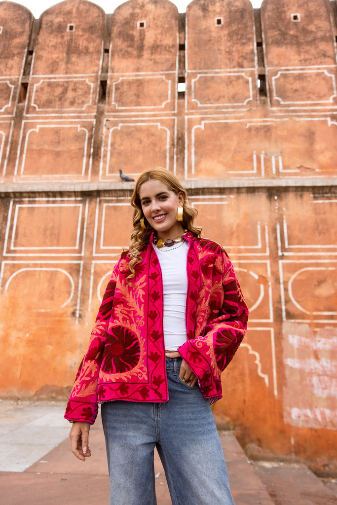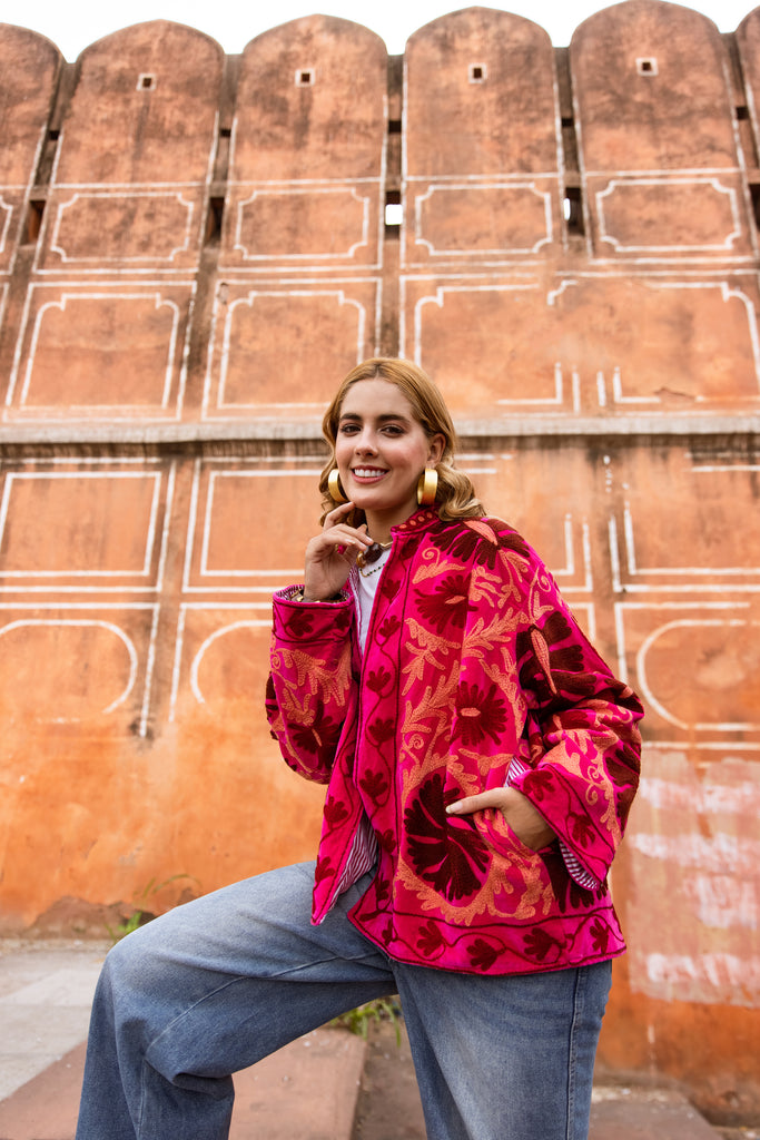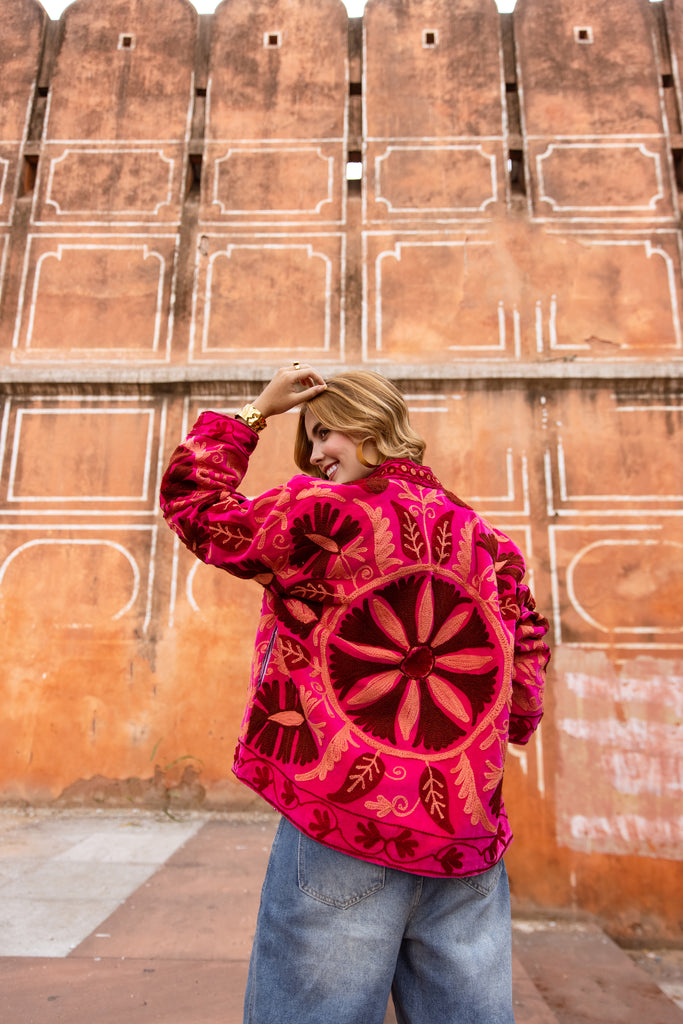 Add a touch of timeless artistry to your wardrobe with our Suzani Embroidered Jacket. Hand-crafted with intricate Suzani embroidery – a traditional Central Asian needlework technique – this statement piece blends heritage craftsmanship with modern styling.