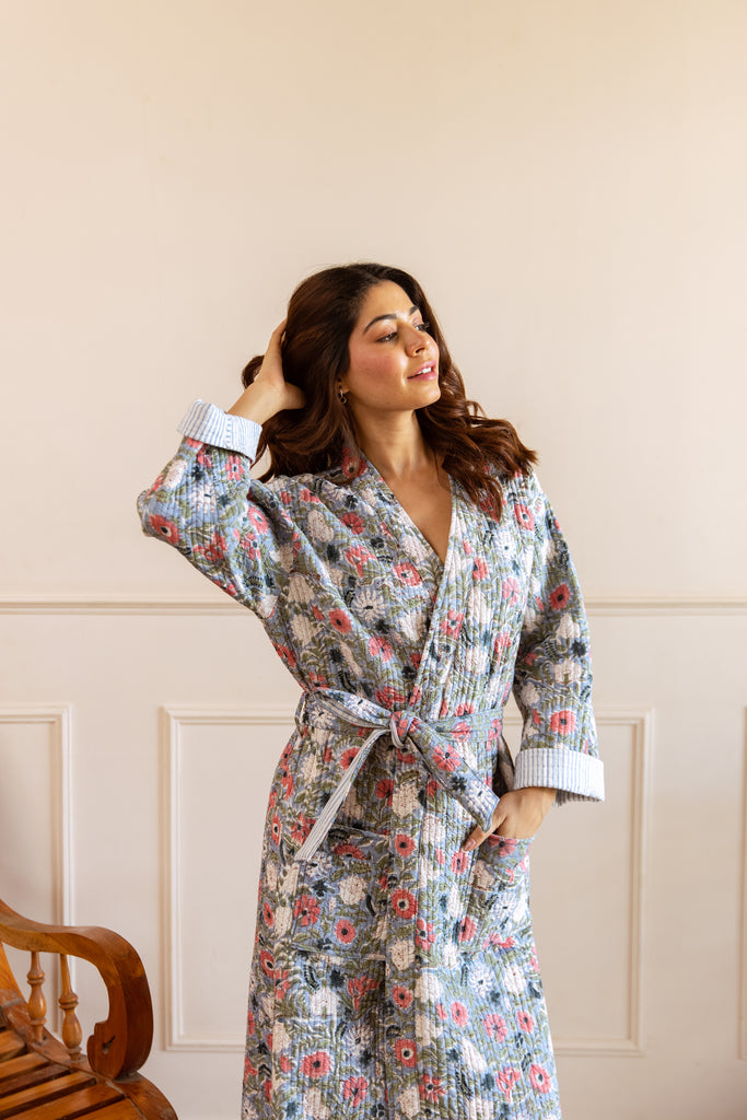 The cosiest of elegant robes in 100% cotton hand block print.