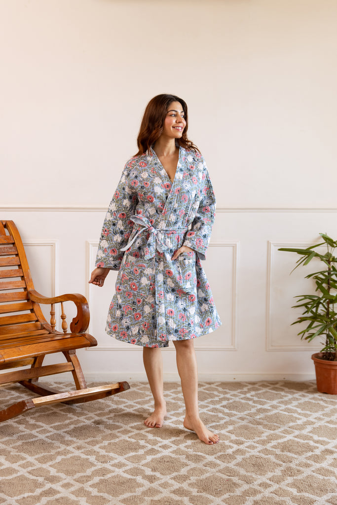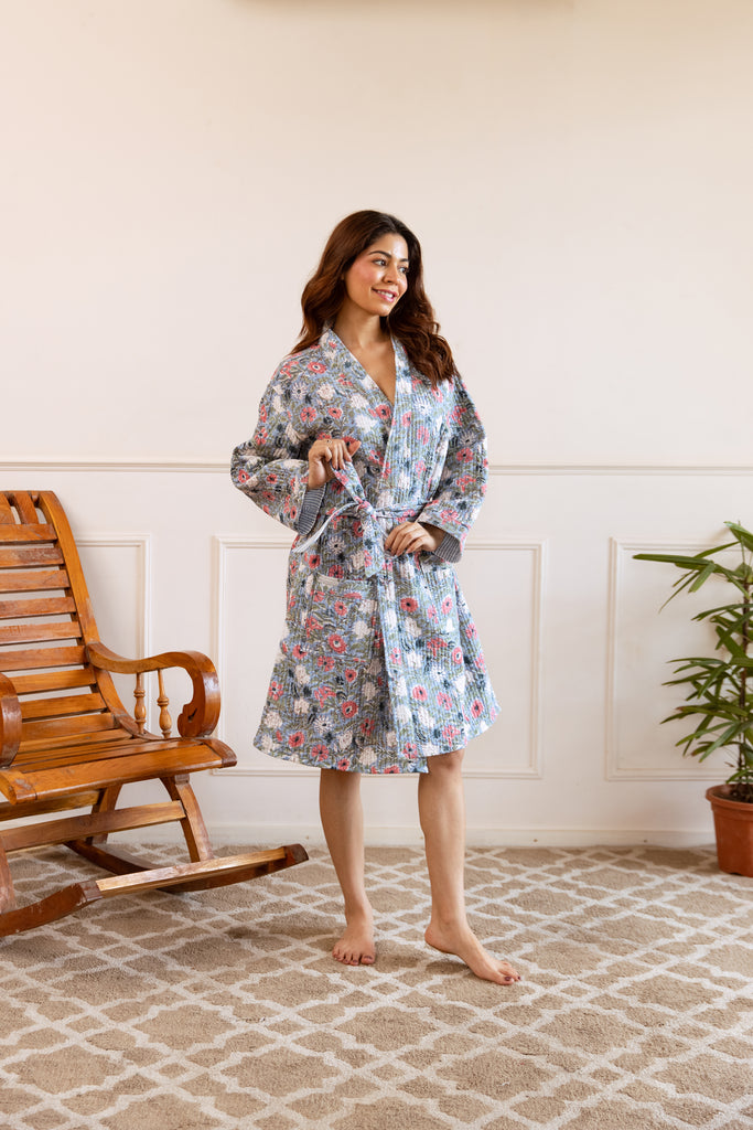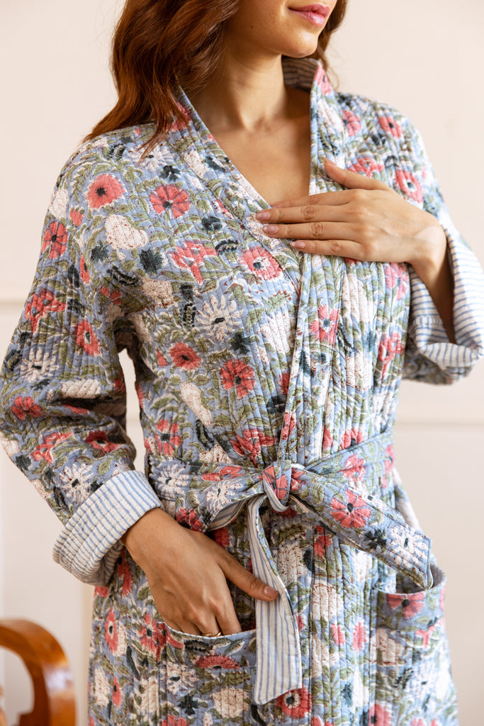 COMING SOONShort Luxury Quilted Hand Block Print Robe - Meadow Bloom